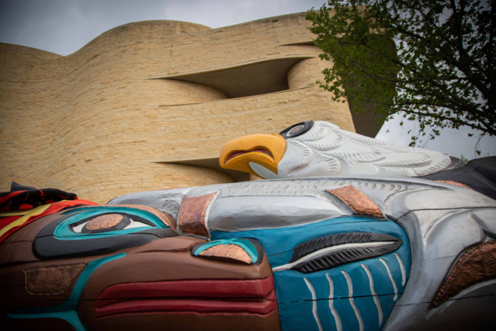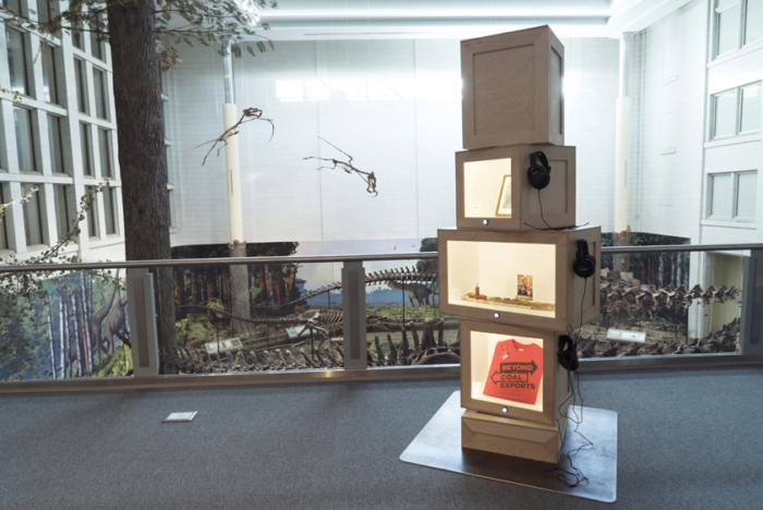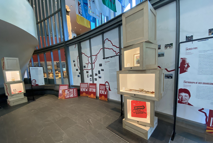 First staged at the Carnegie Museum of Natural History in 2018 and redesigned for the Smithsonian National Museum of the American Indian in 2021, Kwel’ Hoy features video, audio, and interactive components, as well as the totem pole carved for the year’s Totem Pole Journey. The totem poles were paired with a series of Story Poles, vertically stacked shipping crates displaying objects selected by tribal leaders and community members living along the Totem Pole Journey route. From a sacred pipe used in ceremonies to a sample of coal ash from coal trains that have contaminated the Pacific Northwest’s Columbia River, the mix of objects in these displays were accompanied by audio interviews that conveyed the personal stories of climate justice and injustice that these items symbolized.