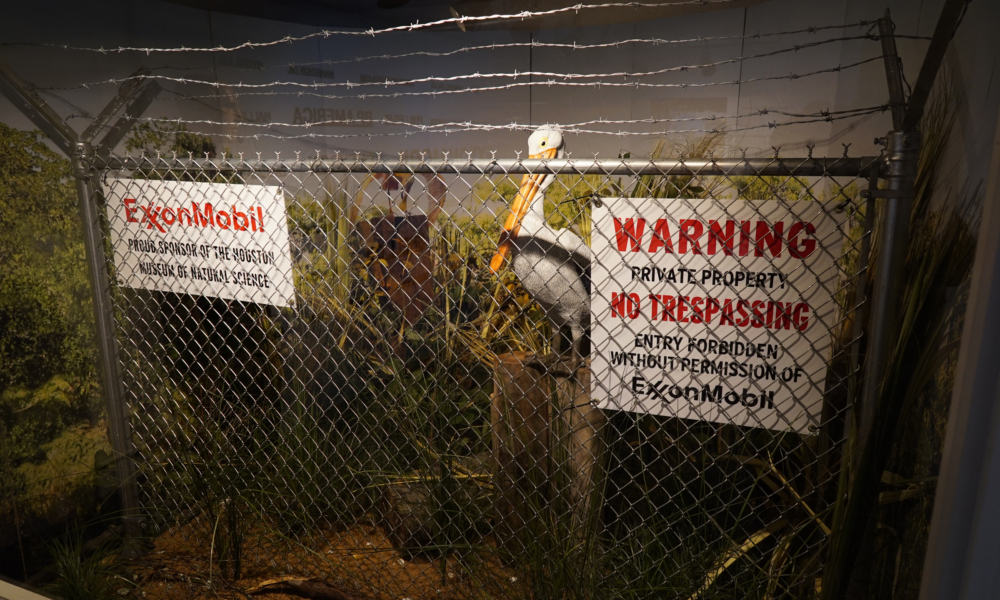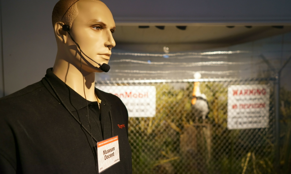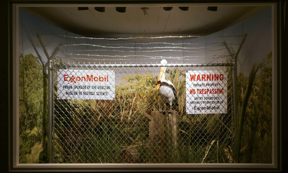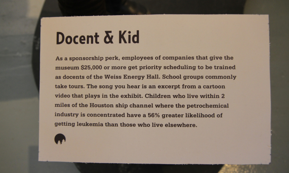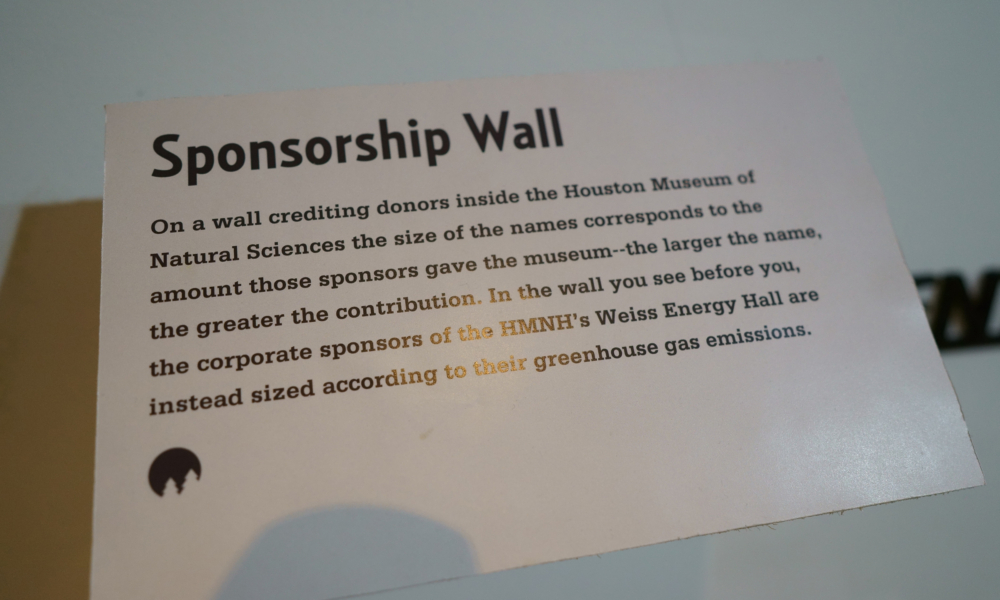 “The exhibit focuses a skeptical and irreverent magnifying glass on the Houston Museum of Natural Science. The provocative question that this exhibit poses is whether the HMNS is a “pr front for the fossil fuel industry?”