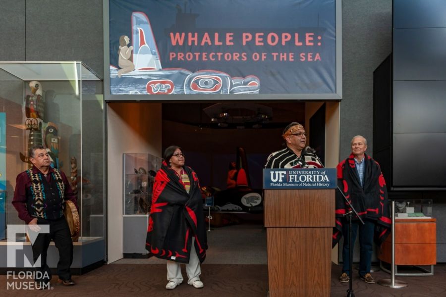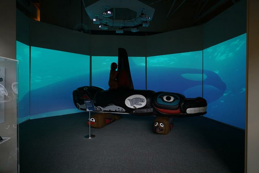 Whale People: Protectors of the Sea brings the whale totem into a museum for the first time, where visitors are invited to lay hands on it as thousands of others have on its journey. Alongside the totem is a selection from the Florida museum’s collection of historical northwest coast totem poles depicting the whale. A seven-channel 90-foot-wide immersive floor-to-ceiling video installation features spectacular underwater footage of the orca, and the voices of Indigenous elders communicate a message that was at the heart of the totem’s journey: what we do to the waters we do to ourselves.