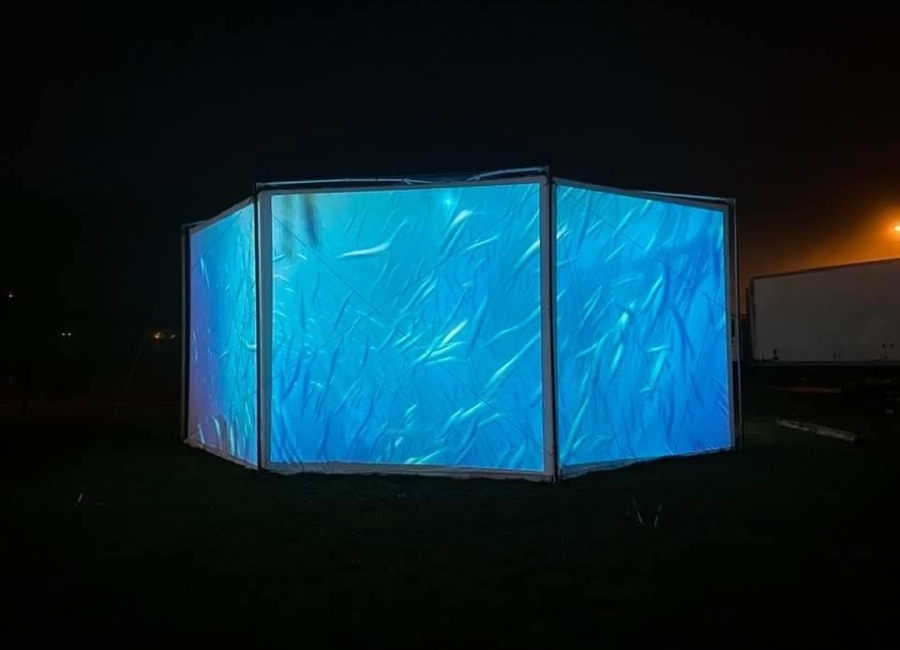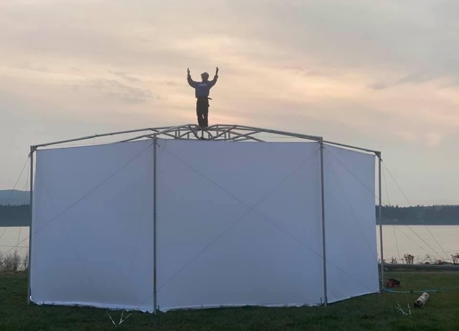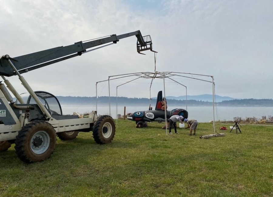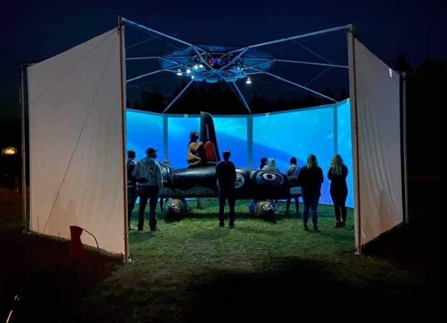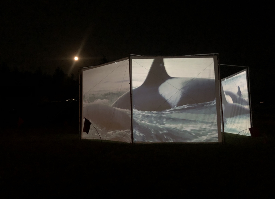 This weekend we debuted our new traveling, outdoor exhibition and IMAX-style film projection venue, with a presentation of “Whale People: Protectors of the Sea“, featuring a 3,000 pound killer whale totem and an award-winning film that tells the story of the environmental emergency through the figure of the orca.